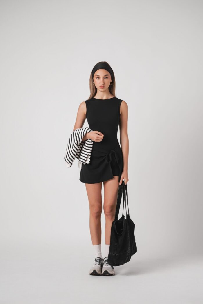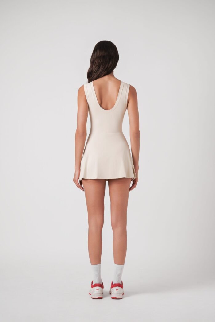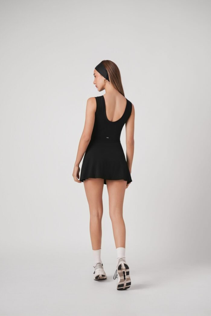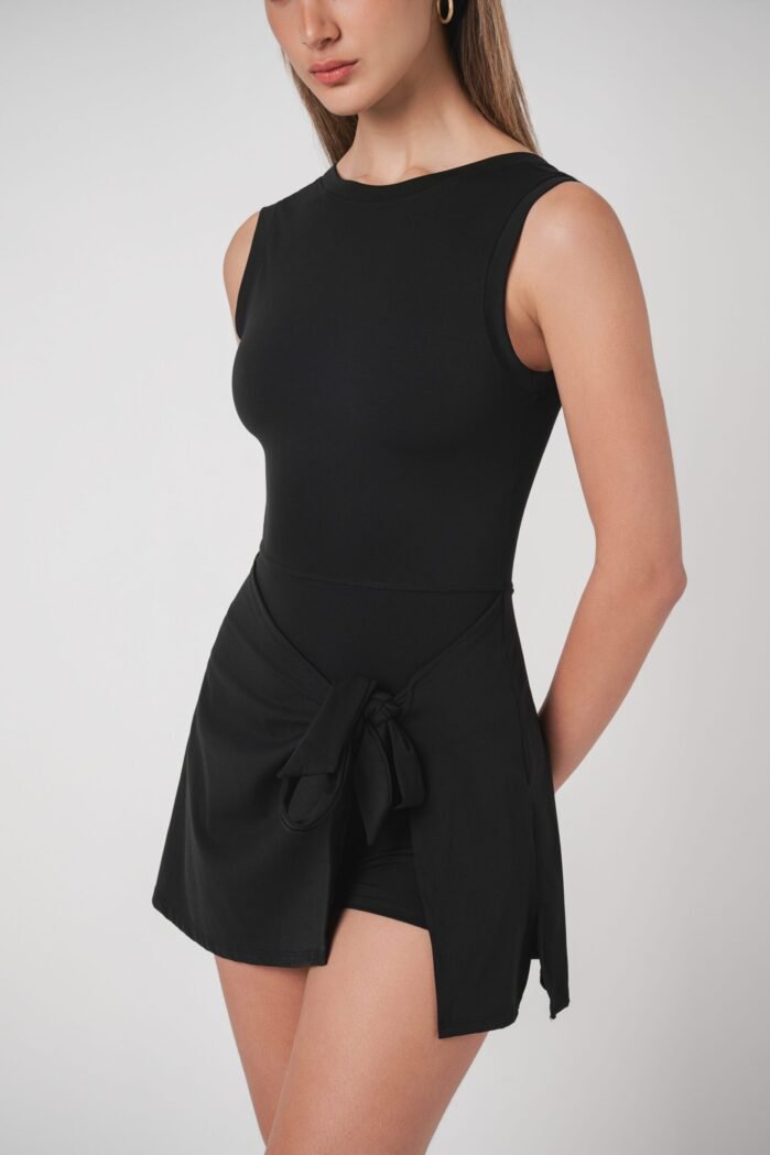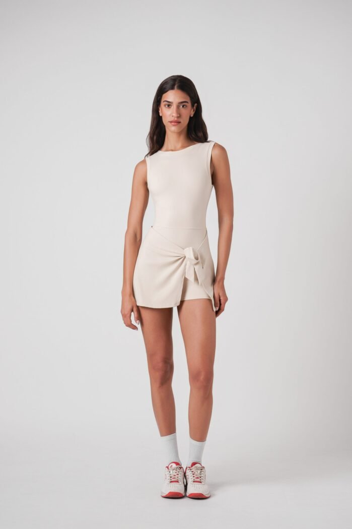 A refined twist on the classic romper, this piece features a sculpted sleeveless bodice and a flattering wrap-over skirt. Designed for performance and elegance, it transitions seamlessly from court to café.